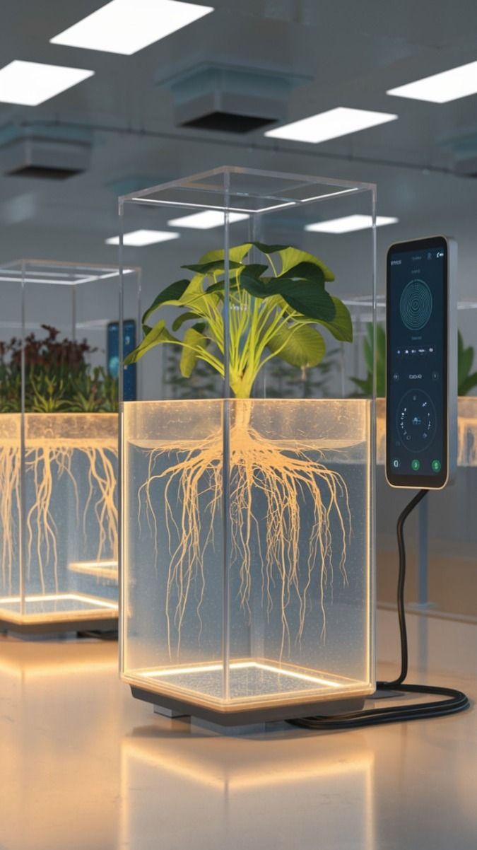 以 IoT 感測器即時監測 pH、溶氧量 (DO)、EC 導電度與溫度。中央控制系統根據數據自動調整營養液濃度與流速。部分進階系統整合 AI 演算法根據植物成長週期預測調節。